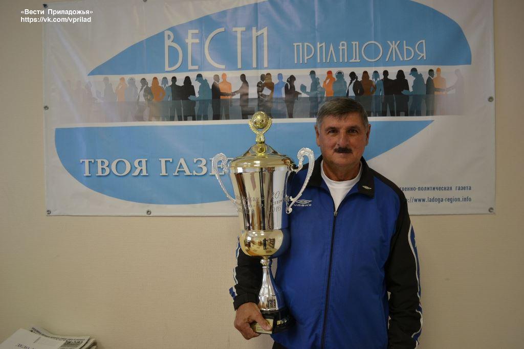 фото: Главный судья открытого первенства Лахденпохского района по мини-футболу на Кубок газеты «Вести Приладожья» с Кубком, который в этом году завоевали воспитанники Лахденпохской ДЮСШ.